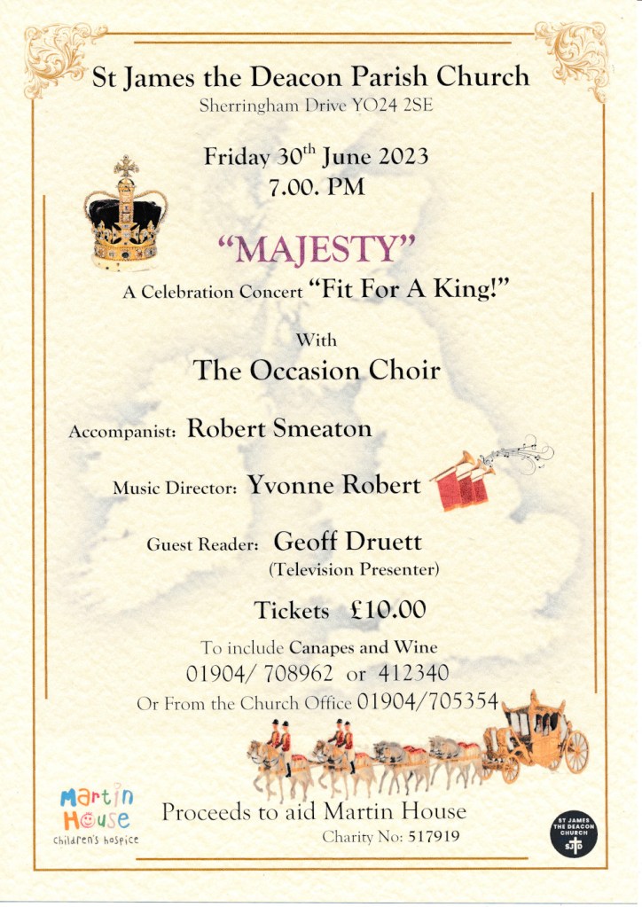 On Friday 30th June at 7pm, the Occasion Choir are holding a Celebration Concert “Fit for A King!”, entitled “Majesty”.
