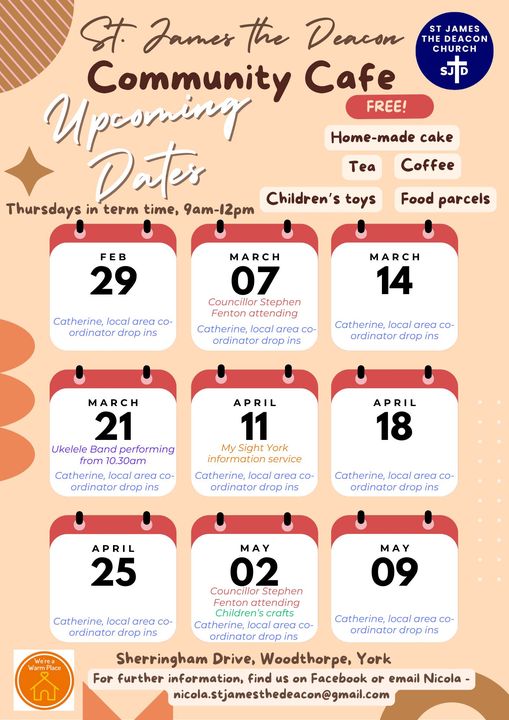 Check the details to see when Councillor Stephen Fenton will be in attendance, as well as visits from My Sight York, and music from local Ukulele band!