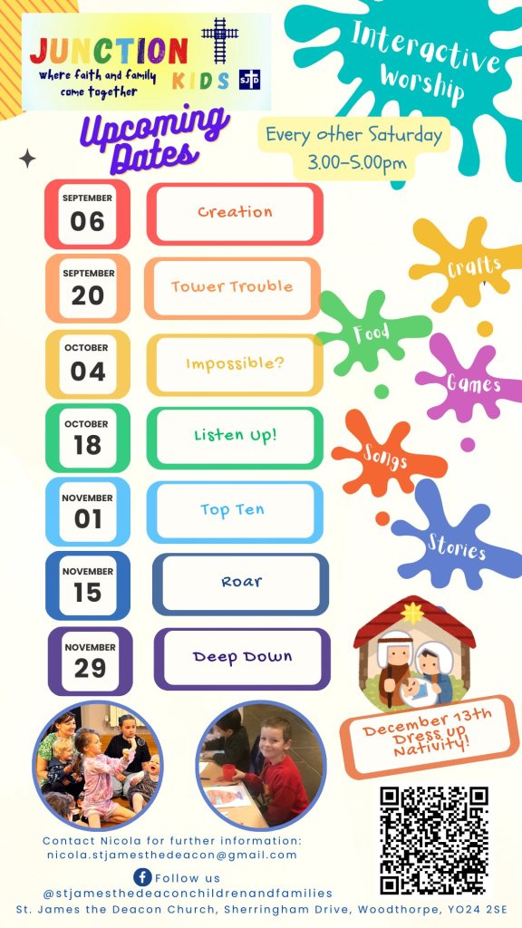 Junction Kids is back on alternate Saturdays (see dates and themes below), our free family worship afternoon, running 3pm-5pm, with songs, crafts, games and food!